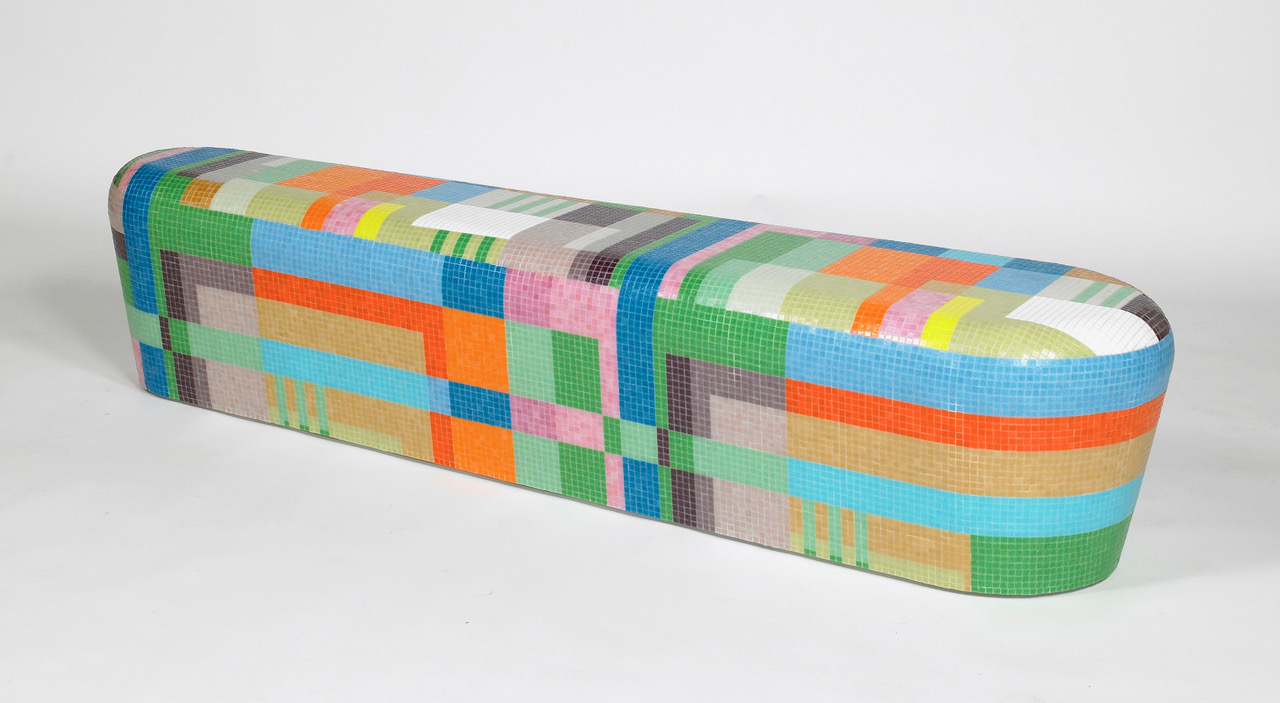 The 'All'aperto' bench is made of mosaics, a material that was used for centuries in the design of Roman baths with Byzantine floors. Mendini was one of the first to bring the material back into fashion, namely on the occasion of his project to decorate the interior of the Groningen Museum in Holland. With Pierre Charpin, he used the material again, presenting it in the bright and colorful palette that Charpin has become known for. In its final form, the piece comes to life and echoes its name — as All'aperto means 'outside' in Italian, and thus posits as an invitation to step outdoors.