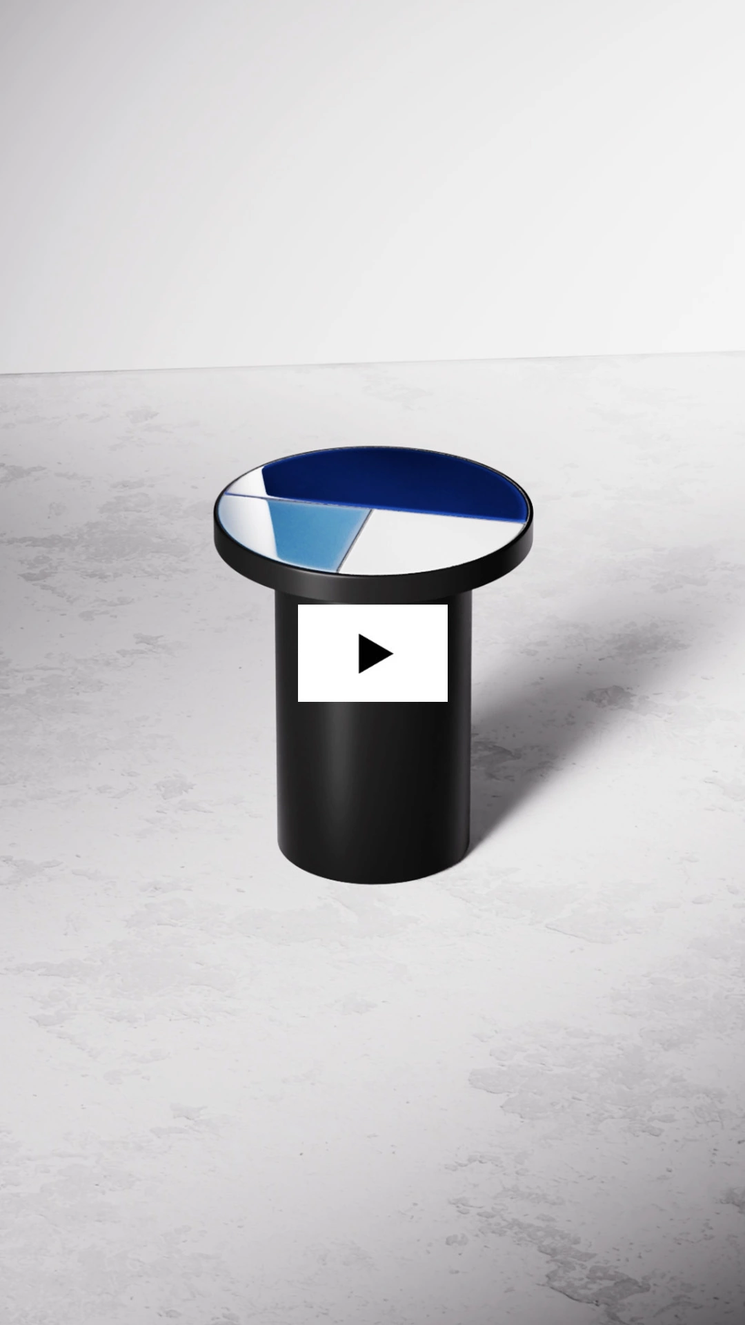 For his third and last animation, Amaury Thiercelin animates Pierre Charpin’s ‘Fraction’ side table — shown here in enamelled navy, cool blue, and white lava stone.