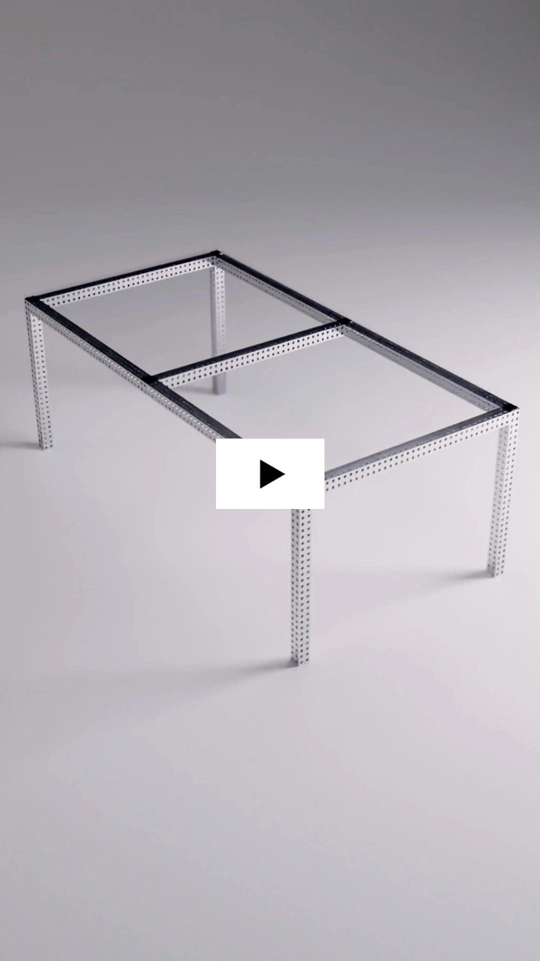 Crafted from punctured steel elements and topped with glass, the “T1” Table is a minimal yet striking piece, taking from the industrial vocabulary of Grcic’s “Transformers” collection. Hugo subtly plays with the perspective of the elements, highlighting their repeated patterns and reflective surfaces. As the animation unfolds, the elements seamlessly come together, revealing the complete form of the dining table.