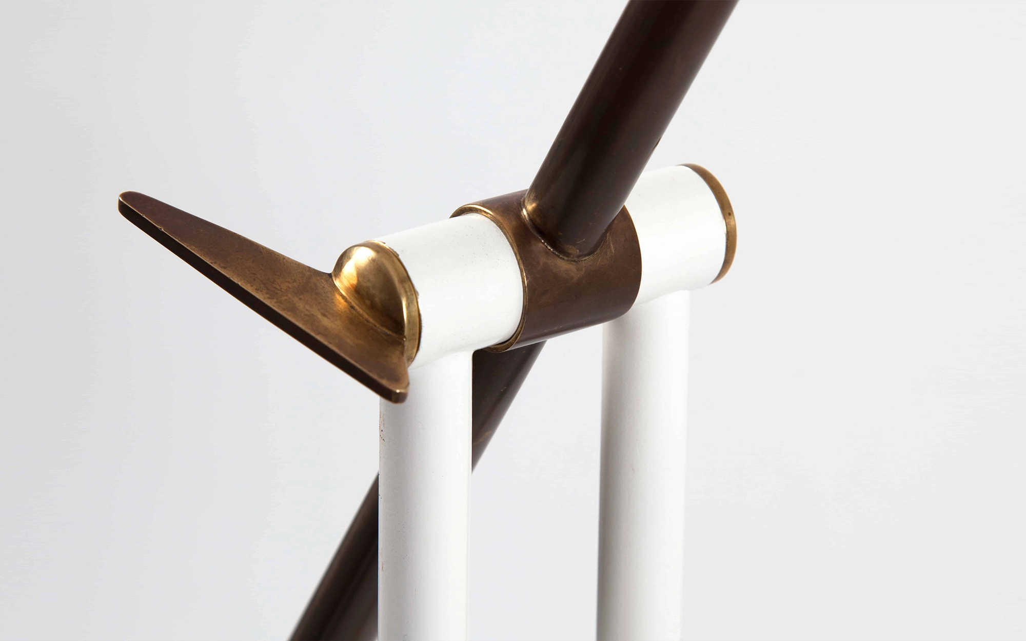 Stem in white lacquered metal, articulated arm in brass with red lacquered metal lampshade and white marble base.